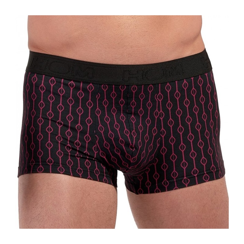 Inspired by the retro style of Las Vegas, the Dunes men's boxer shorts revisit masculine elegance through a geometric design from the 50s. Its burgundy shapes on a black background recall the hushed and sophisticated atmosphere of the legendary Dunes Hotel, a symbol of the glamour of the fifties. Its short, shorty-style cut stops at the top of the thigh and ensures a modern look and great freedom of movement. Made from a blend of cotton, modal and elastane, it offers a soft, breathable and stretchy feel for everyday comfort. These men's short boxer briefs feature an elasticated veil in the hem of the lower legs, guaranteeing a perfect fit throughout the day, and a HOM logo belt that stays in place without rolling. The result is a chic and comfortable shorty-type men's underwear, both retro and contemporary, which combines comfort and vintage inspiration.